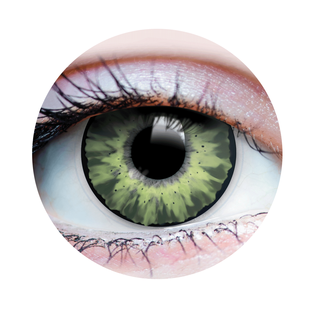 On light natural eyes, these beauty lenses give an almost sunny effect, with a golden green iris and contrasting textured outer ring.