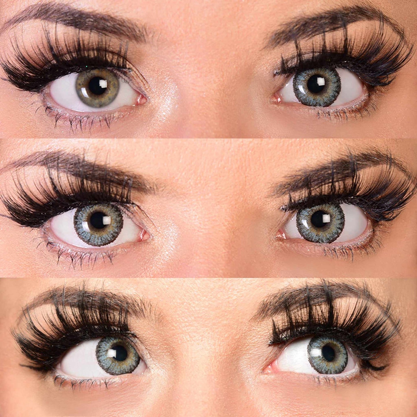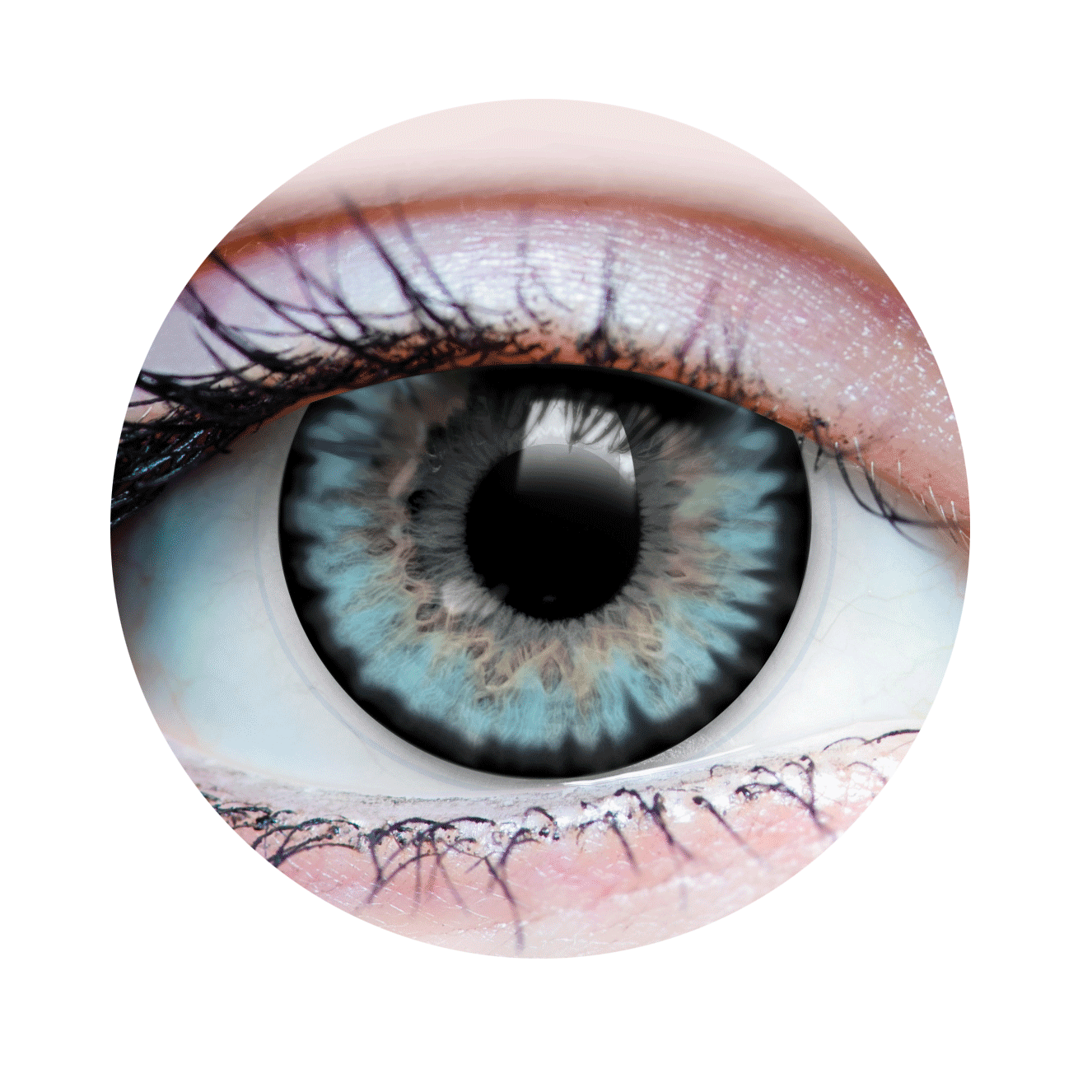 On light natural eyes, these colored contact lenses shine in luminous blue-grey shades, with the outer ring marking a dramatic contrast.